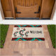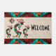 Personalise this Unique "One of a Kind" Southwest Kokopelli Doormat! It Features a Three Kokopelli Playing the Flute and Dancing Under the Sun on a Tan Sandstone Background...Surrounded by a Southwest Border in Turquoise, Orange and Black!
