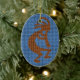 This unique Christmas ornament features a traditional Native American Kokopelli with flute. The brown Kokopelli stands out against a blue background both of which display a mosaic or tiled pattern. The Kokopelli is a Native American folk design and typically a favourite among music lovers and music teachers.