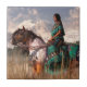 An American Indian woman rides a dun and white spotted mustang horse through a field of tall grass. Off in the distance a forest of fir trees lines the grassland. Behind the forest, sharp, rocky, snow covered peaks rise high into the sky where wispy pink clouds drift lazily by. A gentle wind blows picking up the horse's black mane and tail. Her saddle and garb are both black with turquoise fringes. The repetitive symbol of Kokopelli, the fertility spirit, fill the open spaces of the material. Kokopelli is a fertility deity from American Indian cultures of the Southwest. It is theorised that he is based upon a real type of person, a kind of travelling merchant, storyteller, reporter, and entertainer. You might say he is the Native American equivalent to a European bard,troubadour, or minstral. Generally, he is depicted alone, but in some renditions, he has a consort or wife known as Kokopelmana or Kokopelli-mana. Here I have depicted her as a real person, a travelling story teller riding a horse through the American Wild West.