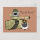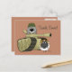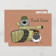 Post Card showing an adorable, shaggy Komondor dog inside a tank wearing a helmet, next to a sheep wearing an aviator cap. Caption on the postcard reads, "Tank Ewe!". Background is displayed as a rust colour, but it and the font and phrase can easily be customised to whatever you'd like.
