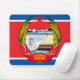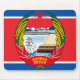 The National Emblem of the Democratic People’s Republic of Korea bears the design of the Sup'ung Dam under Baekdu Mountain and bearing the beaming light of a five-pointed red star, with ears of rice forming an oval frame, bound with a red ribbon bearing the inscription "The Democratic People's Republic of Korea" in Hangul characters.