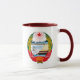The National Emblem of the Democratic People’s Republic of Korea bears the design of the Sup'ung Dam under Baekdu Mountain and bearing the beaming light of a five-pointed red star, with ears of rice forming an oval frame, bound with a red ribbon bearing the inscription "The Democratic People's Republic of Korea" in Hangul characters.