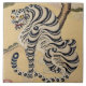 A ‘Minhwa’ represents Korean folklore created by unknown artists over centuries. The tiger is a figure associated with the Korean culture and an ugly or misshapen animal can represent foolish or corrupt aristocrats according to legend. This minhwa depicts a contorted striped tiger.