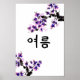 a decorative calligraphy artwork featuring the korean word for "summer" in hangul among beautiful purple coloured flowers or floral elements growing from trees as a decorative poster print.