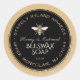 This apiary product label is fully editable. Personalise with your apiary name, location, product description and container size. Black circle on a kraft background and brown text. Heraldic honey bee illustration is a vintage mediaeval design.
