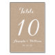 Elegant White Script Wedding Table Number Card | Beige Kraft Paper. Elke Clarke© for MonogramGallery at Zazzle. Printed kraft paper photo effect. Add your table number and then add an order of "1" to your cart. Then repeat by adding the number "2" to the card and then add an order of "1" to your cart and repeat until you have one card with each of your table numbers in your cart.