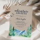 This kraft Rocky Mountain adventure awaits baby shower invitation is perfect for an outdoor event. The design features a blue and green painted wilderness landscape with watercolor pine trees, birds and mountains on a faux light kraft paper background. The invitation is perfect for a baby shower, graduation, retirement party and more!