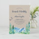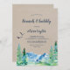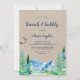 This kraft Rocky Mountain brunch and bubbly invitation is perfect for an outdoor wedding shower. The design features a blue and green painted wilderness landscape with watercolor pine trees, birds and mountains on a faux light kraft paper background.