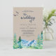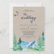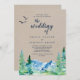 This kraft Rocky Mountain destination wedding invitation is perfect for an outdoor wedding. The design features a blue and green painted wilderness landscape with watercolor pine trees, birds and mountains on a faux light kraft paper background.