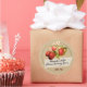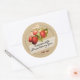 "Homemade Strawberry Jam" is handwritten in black ink in a lightly embossed script font on a ripped masking tape label 'taped' onto a kraft circle. The editable NET WEIGHT is 'written' with a dark red 'marking pen' font. Order this label on 'matte' for an old-fashioned look.