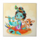 Krishna the Holy Indian God playing flute illustration sitting next to a cow with jasmine garlands, peacock feather and bird composed art.