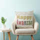 Kwanzaa home decor Throw Pillow celebrating through word art and orignal creative pattens oversied textured letters in attractive Kwanzaa colours. The pillow is trimmed top and bottom in original village style pattern design. Simple and elegant. The Happy Kwanzaa Pillow is reversible offering a nicely coordinated pattern that works well with the Kwanzaa Words Pillow. Time to celebrate first fruits in style. Kwanzaa is everyday.