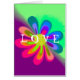 A colourful retro peace flower is the background for the text, "L O V E" on this greeting card. The inside is blank so you can use the card for any occasion.