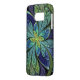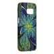 Abstract Samsung Galaxy case with "La Chanteuse IV," an Apophysis fractal by Susan Wallace. Copyright © 2010, Susan Wallace. Faux stained glass leaves of green and turquoise frame a central flower in shades of blue and purple.