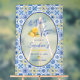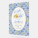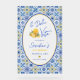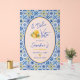 An acrylic birthday party welcome sign with an elegant "La Dolce Vita" theme featuring chic Mediterranean tile patterns in blue, white, and yellow with citrus lemon gelato illustrations, reminding you of a summer holiday in southern Italy. Feel free to message me if you need any help with customisation.