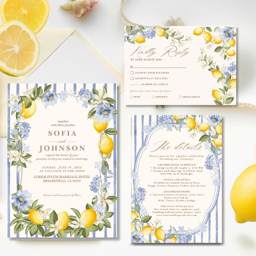 Inspired by the beauty of the Amalfi Coast and Tuscan summers, this lemon wedding menu card adds a fresh, romantic, and timeless touch to your table décor. The combination of citrus illustrations, soft blue florals, and classic typography creates a luxurious yet cheerful aesthetic that pairs beautifully with Italian, Mediterranean, citrus, or summer wedding themes.