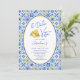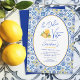 A birthday party invitation with an elegant "La Dolce Vita" theme featuring chic Mediterranean tile patterns in blue, white, and yellow with citrus lemon gelato illustrations, reminding you of a summer holiday in southern Italy. Feel free to message me if you need any help with customisation.