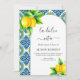 La Dolce vita Mediterranean tiles citrus lemon bridl hower invitation. Envision a bridal shower invitation that evokes the sun-drenched charm of the Mediterranean – a design that whispers of "La Dolce Vita." This invitation captures the essence of Italian style with a captivating pattern of blue and yellow tiles, meticulously arranged to create a sense of timeless elegance. Adding a touch of vibrant natural beauty, delicate branches adorned with ripe, golden lemons playfully frame the design, appearing in the upper left and bottom right corners. These citrus accents provide a subtle hint of the joyful celebration to come. The phrase "La Dolce Vita," artfully rendered in a script font, is presented alongside other essential details within a graceful arch that curves along the right side of the invitation, beautifully complementing the overall composition and drawing the eye to the information it contains.
