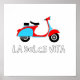 A poster depicting an iconic scooter and the words La Dolce Vita...the sweet life in Italian. A nostalgic reference to the film Roman Holiday and travellin round Rome on the iconic Vespa scooter.