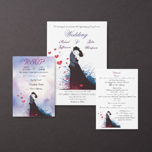 This elegant and artistic design blends romance with a modern, expressive design. The centerpiece is a silhouette of a couple embracing passionately, symbolising love and unity. The artwork features a creative splash effect in shades of deep blue, red, and black, adding a contemporary and dynamic touch. Scattered hearts enhance the romantic feel, while the stylish calligraphy font lends a timeless elegance.