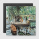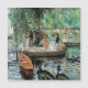 Pierre-Auguste Renoir. La Grenouillère . lovely landscape on the river in green tones. There are boats on the shore. In the middle ground, a group of people stands on a walkway under a spreading tree. In the background there are yazta and trees. Reproduction of famous works of art images in the public domain.