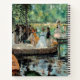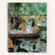 Pierre-Auguste Renoir. La Grenouillère . lovely landscape on the river in green tones. There are boats on the shore. In the middle ground, a group of people stands on a walkway under a spreading tree. In the background there are yazta and trees. Reproduction of famous works of art images in the public domain.