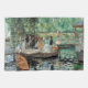 Pierre-Auguste Renoir. La Grenouillère . lovely landscape on the river in green tones. There are boats on the shore. In the middle ground, a group of people stands on a walkway under a spreading tree. In the background there are yazta and trees. Reproduction of famous works of art images in the public domain.