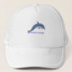 El elemento central es un delfín estilizado representado con un patrón que recuerda al arte, está saltando o nadando sobre un conjunto de olas vibrantes. Los colores predominantes son el azul turquesa, el azul marino oscuro y toques de blanco o un color de contraste, que destacan sobre el tela de otro color a crema, lino o blanco roto de la gorra.