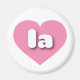 This magnet features a vibrant pink heart containing the bold, white, rounded lower case letters la, a playful abbreviation for Louisiana, the pelican state OR Los Angeles, the city of angels.