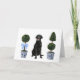 These greeting cards feature a watercolor portrait of a black lab sitting in between two chinoiserie style topiaries.