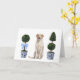 These greeting cards feature a watercolor portrait of a yellow lab sitting in between two chinoiserie style topiaries.