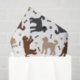 Cute labradoodles in brown, black and tan coats sit, stand and lay with scattered dog bones and paw prints on a white background.