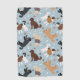 Cute Labradoodle / Goldendoodle dogs sit and stand and rollover with cream, apricot, chocolate, black and parti coats with scattered dog bones and pawprints pattern.