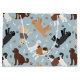 Cute Labradoodle / Goldendoodle dogs sit and stand and rollover with cream, apricot, chocolate, black and parti coats with scattered dog bones and pawprints pattern.