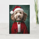 This image features an adorable Labradoodle dressed in a festive Christmas outfit. The dog is wearing a red Santa hat with a fluffy white trim and a matching red velvet coat with white fur accents. Around its neck is a green collar with a red, paw-shaped tag. The Labradoodle’s curly fur and expressive eyes give it an endearing, heartwarming look, perfectly capturing the holiday spirit against a soft green background.
