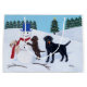 Labrador Christmas with Snowman gift bag. Whimsical Labrador Retriever painting painted by Naomi Ochiai from Japan. Nice for dog lovers who love Labrador Retriever dogs. Yellow Labrador and Chocolate Labrador and Black Labrador are all painted in the picture. Three Labrador dogs are playing with their snowman in the white snow field. Typical Christmas Holiday season scene.