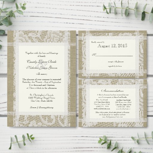 Country Romance invitation with the printed look of lace and burlap. Customise text and fonts to suit your own style. The look of burlap with lace printed invitations. All parts of these invitations are printed. There is no actual lace or burlap connected. Feel free to contact me for elements not represented here. I may be able to help.