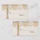 Elegant white lace, ribbon and flower on burlap wedding seating place card featuring white lace on linen natural burlap or hessian with two crossed satin ribbons and flower in beige with metallic shine and a white jewel. Text in brown. Note that lace, burlap, flower and jewel are all “printed on” and not real fabric, gem or crystal. This elegant, sophisticated and romantic design with a rustic essence is part of a wedding set and is perfect for a country chic or western spring, summer or fall/autumn wedding with a neutral colour palette.