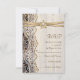 Elegant white lace, ribbon and flower on wood wedding RSVP reply/response card featuring white lace on brown old wood with two crossed satin ribbons and flower in beige with metallic shine and a white jewel. Text in brown. Note that lace, wood, flower and jewel are all “printed on” and not real fabric, wood, gem or crystal. This elegant, shabby chic sophisticated and romantic design with a rustic essence is part of a wedding set and is perfect for a country rustic chic wedding or for a western spring, summer or fall/autumn wedding with a neutral colour palette.