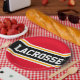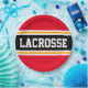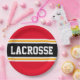This sporty, athletic design features bold LACROSSE text inside a highlighted wide black stripe with double white and yellow racing stripes against bright red background stripes. The text in this design can be personalised.