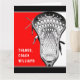 Unique lacrosse coach thank-you card featuring a creative thanks from the team and a lax stick illustration on red background. To personalise edit text to add name and otherwise customise.