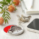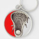 Unique lacrosse collectible keychain featuring lax illustration on a red background.