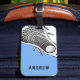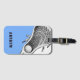 Unique lacrosse gear bag tag lax design illustration on light blue background. Edit text to add name of player or team coach.