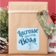 Script design in blue tones with the text LACROSSE LIKE A BOSS and a lacrosse stick and ball graphic.