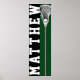 Personalised lacrosse poster featuring lax stick illustration on green background. Edit text to add player's name or otherwise customise.