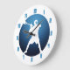 Lacrosse Shooter. Locked, cocked and ready to rock. Silhouette of lacrosse player holding stick, in the midst of firing a shot on goal. Circular emblem design in blues with emanating rays. Lacrosse player clock. Sports theme wall clock.