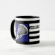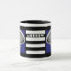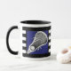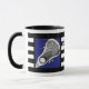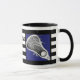 Unique lacrosse collectable mug, featuring lax stick art on a blue background with black and white stripes. Edit text to add the name of your favourite lacrosse player, coach or team sports fan.