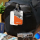Unique lacrosse gear bag tag featuring lax stick design illustration on an orange background.