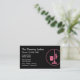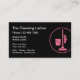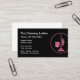 Simple cleaning service business card design with pink cleaning emblem that has a mop, mop bucket, and rubber gloves for cleaning. Designed for a housekeeping service team or independent professional that does home or office cleaning.