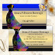 Business card featuring an elegant dress layout on a striped design background. The background colors on front and back are different, but you can copy/paste the design from front to back or vise versa if you prefer one color. A beautiful business card for a ladies fashion retailer or seamstress.